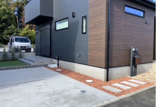 駐車スペースを拡張し、使い勝手と美観を兼ね備えたデザインになりました。玄関アプローチから駐車場につながる部分には、アクセントとしてレンガチップを敷設。これにより、駐車場スペースを最大限確保しながら、デザイン性も高めています。土間コンクリート仕上げのシンプルな構成が住宅の外観に調和し、利便性と美しさを両立させた施工事例です。