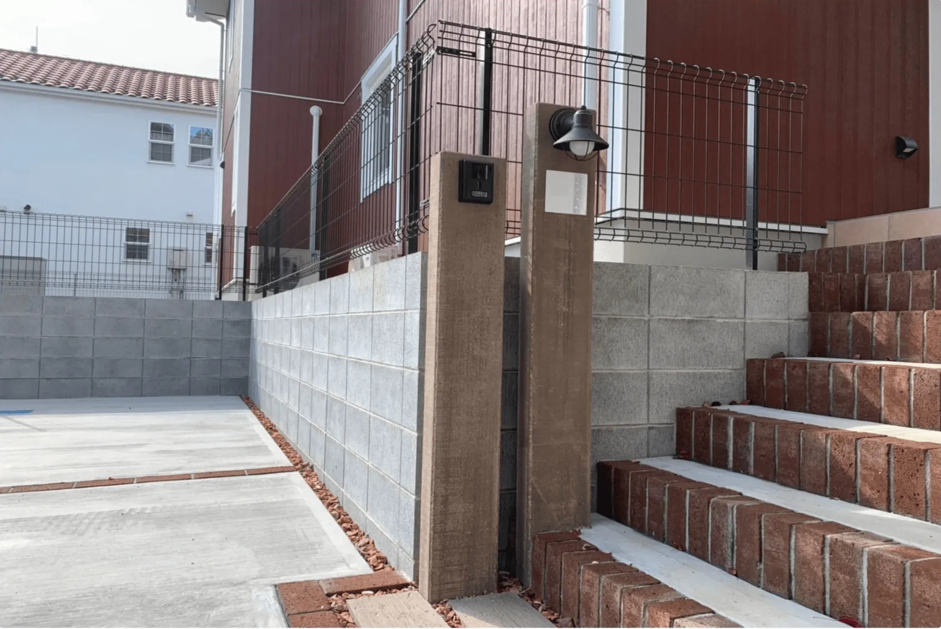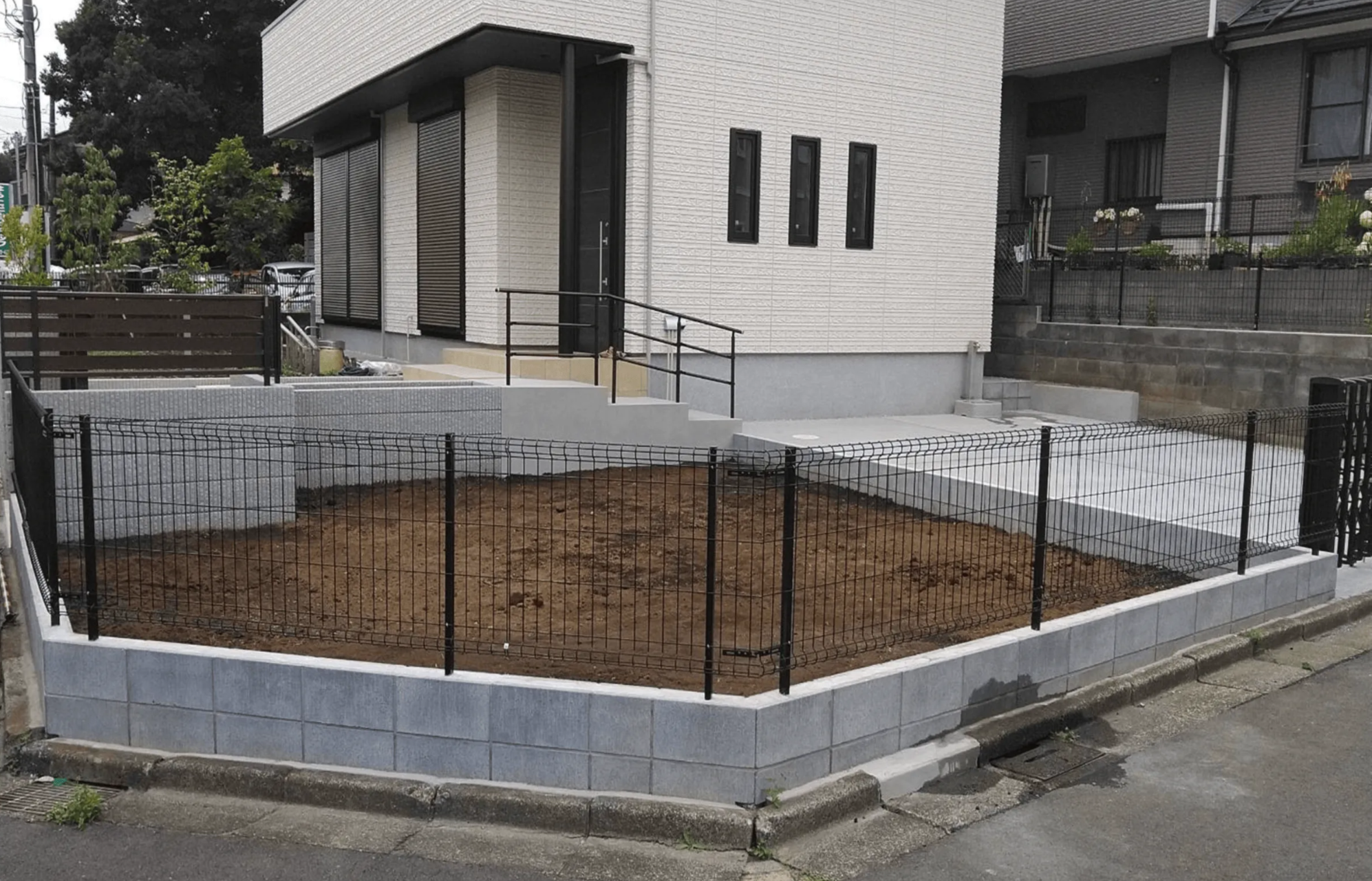 グレーの化粧ブロックにブラウンのフェンスを組み合わせた外構工事を実施。隣地境界には防犯対策としてメッシュフェンスを設置し、安全性とプライバシーを向上。落ち着いたデザインが住宅に調和し、美観と実用性を両立しました。新築住宅に最適な防犯外構の施工事例です。