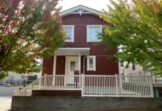 白とレンガ色の住宅に合わせたおしゃれなフェンスと門柱を設置。列柱にインターホンと照明を取り付け、防犯性を高めつつ美しいデザインを実現しました。海外製のポストや手摺も採用し、個性を引き立てた外構事例です。夜間も安心できる安全な住環境を提供します。