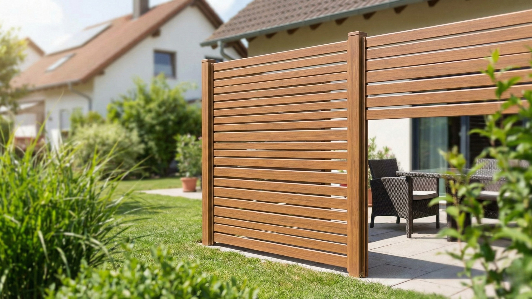 人工木)フェンス: 温かみのある木目調でありながら、天然木のように腐食しにくく、お手入れが簡単です 。