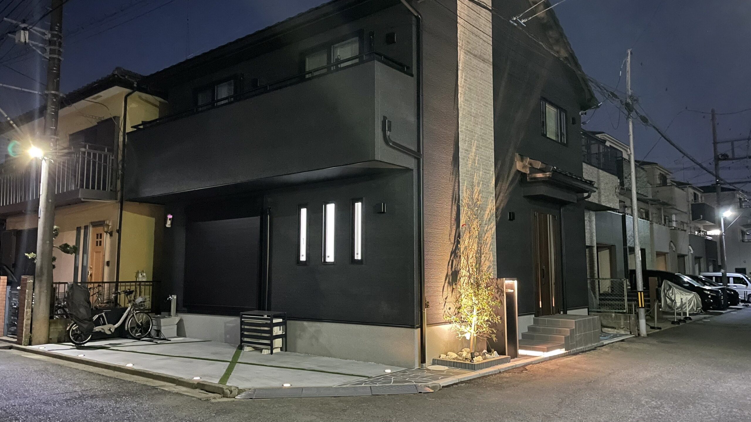 シンプルな外構ですが、ライトアップするとシンボルツリーの常緑ヤマボウシがとても幻想的に浮かび上がるおしゃれなエクステリアに仕上がりました。