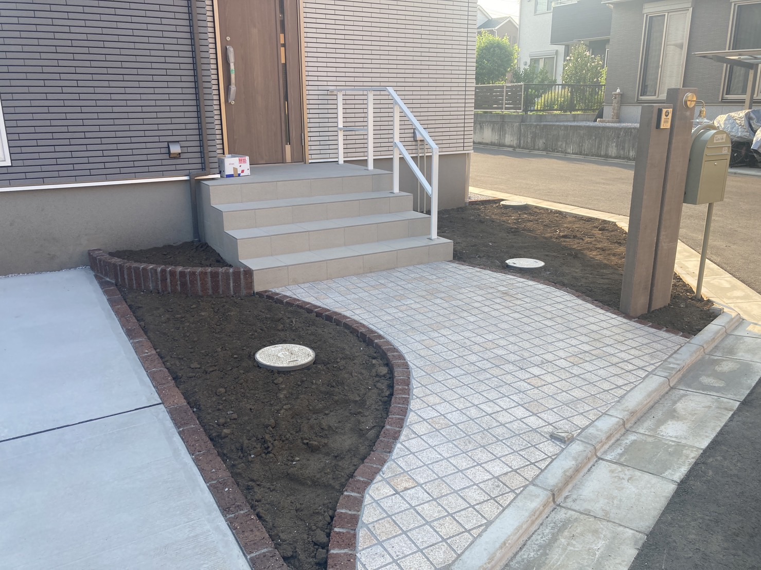 お家の色に合わせたスクエアピンコロ/ヒラピンをアプローチに敷き詰め、チョコ色で縁取りをしました。